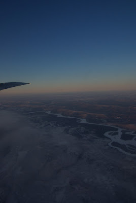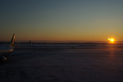 朝起きると、宿の前にタクシーが待っていた。真新しいSUV(Sport utility vehicle) をおばさんが運転していた。名前を告げ、フェアバンクス空港までとお願いする。まだ暗い町を抜けて空港に。早く着いたので売店を見てみるけれど、やっぱりお土産は買う気になれない。エスキモーの顔が描かれたアラスカ航空の飛行機を見て待ちぼうけていると、滑走路の向こうから太陽が昇ってきた。やっと、日の出だ。