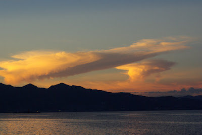 気持ちいい。すごく面白い形の雲がいくつも。夕日に染められ、空がいい色になっていく。
