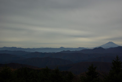 そんなことをしながら、星を見ようと夜中に何度か空を見上げたが、雲で星はあまり見えなかった。翌朝、日の出に合わせて6時前に外に出て東の空を眺めていた。しかし、雲が厚い。東の空の一部が少し赤くなったが、日の出は見ることができなかった。30分ほどでテントを片付け、朝食を済ませて、7時に下山することにした。雲取山の頂上では朝と言うこともあってか、昨日よりも富士山がはっきりと見えた。その前に連なる山々は水墨画のように、霞んでいて幻想的であった。