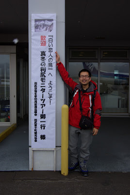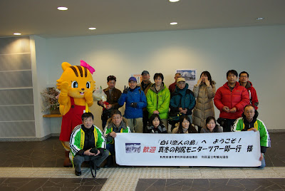 すぐに利尻島に着陸した。タラップを降りて滑走路を歩くと強風が全身に当たった。こんな風でも着陸できたのかと思う程の風で、服はバタバタ音をたてるし、髪は風にたなびいた。というのは少しばかりウソで、髪の毛は坊主なのでたなびかなかった(笑)。空港に到着すると、リップちゃんという利尻島のマスコットキャラクターと観光協会の方が迎えてくださった。昨日飛行機が飛ばなくて、急遽プランの変更などもあって大変なのに、みなさん笑顔で迎えてくださった。感謝。みんなで記念撮影。パシャリ。