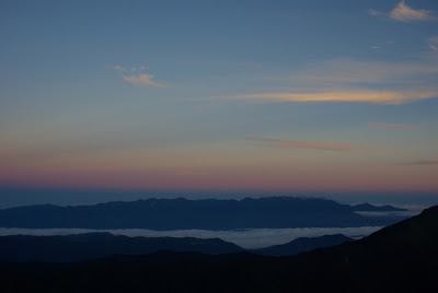 そんな自然のおおきな流れに沿った時間を過ごしている幸せ、自然の一部になったと思える喜び、をかみしめながら夕日を待った。北岳山荘から間ノ岳方面に少し昇ったところは西の空も富士山も見ることができ、誰もいない場所だったので、ここでしばし楽しむことにした。西の空は変化していく。太陽の高度が下がり色が変わっていくだけではなく、雲がとても速いスピードで動いていくのだ。下の方から雲が上がってきて、僕を包み込み去っていく。そんなことの繰り返し。その雲は黄金色に色付けられているので、少しだけ不気味な感じもした。太陽は沈み、富士山は麓から徐々にピンク色の雲で彩られ、ついに頂上までピンク色で覆われた。なかなか面白い光景で、グラスにジュースを注ぎ、どんどん溜まっていって表面張力でも耐えられなくなり、溢れるような感じだった。