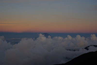 飯を食おうとすると、また雨が降ってきた。急いでテントの中に潜り込み、夕食をとった。朝も早かったので、眠たくて仮眠。銀マットとエアマットの2重にしてから、山での睡眠が家よりも快適に感じ、ぐっすり。なにやら外が騒がしいので18時30分ごろ目が覚め、テントのチャックを開ける。すると、雨がやみ、富士山が顔を出したようだった。そして夕日の時間も迫っていた。良い時間に起きれた。夕暮れの時間を楽しむことに。