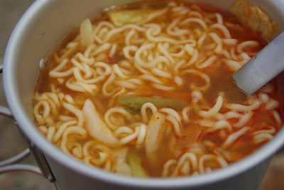 すると、雨が小雨になり、止んだ。また降り出すと嫌なので、雨が上がっている間にどんどん先へ進むことにした。厚い雲で景色も見れないので、ただひたすら登って16時ごろに北岳肩の小屋に到着。約4時間程で広河原から着たことになる。こんな時間だからテント場はテントで溢れていた。場所を見つけてテントを張る。雨は降っていなかったので、雨具など濡れた物をテントの屋根で乾かしながら、夕食を作る。今日はラーメンにカット野菜を入れて終了。それとおにぎり1つ。なんとも簡単メニューだ。友達と一緒だともう少し作るのだが、一人だとついついこうなる。さらに、山の上という調味料も加わりそこそこ上手いのだ。
