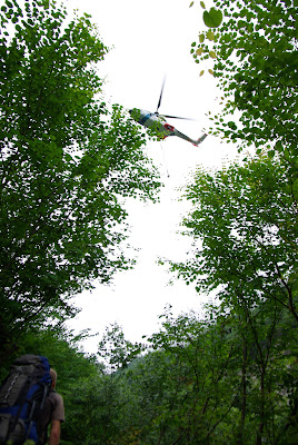 晴れの天気予報だったけれど空は雲で覆われていた。それもどんよりとした雨を降らしそうな色をしていた。歩いていると、フランス人の兄ちゃんが話しかけてきた。日本在住4年で日本語はなかなか上手かった。時おり英語を混ぜながら、会話。テント泊をして北岳に登るのだと言う。それも今回で2回目。山好きなんだなー。話していると、ヘリコプターのけたたましい音が。超低空飛行で飛んでいる。何かを運んでいるようだった。すると、真横に減りがホバーリングしたと思ったら材木などを降ろしていった。はしごにでも使うのだろうか。