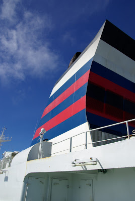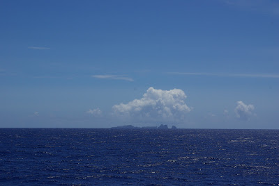 25時間40分の時を経て小笠原に到着した。そう、その前に船内見学をさせてもらった。操縦室とエンジンルームの2つを。操縦室はやはり気持がいい。飛行機のコックピットのように、真正面の視界には青い海が拓けている。舵があったり、いろいろな機器、そして海図が広げられている。この時代だから新大陸を見つける航海なんてありえないけれど、船乗りでない僕に取っては、操縦室は新大陸を発見するための場所に感じられた。そして、エンジンルームは55度という暑さ。