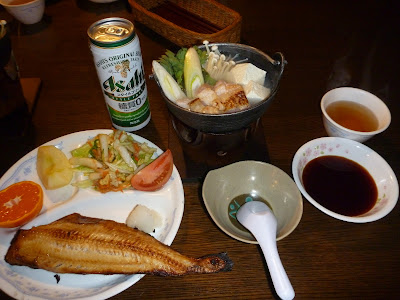 とても大きなホッケの塩焼きと鳥肉が入った鍋。